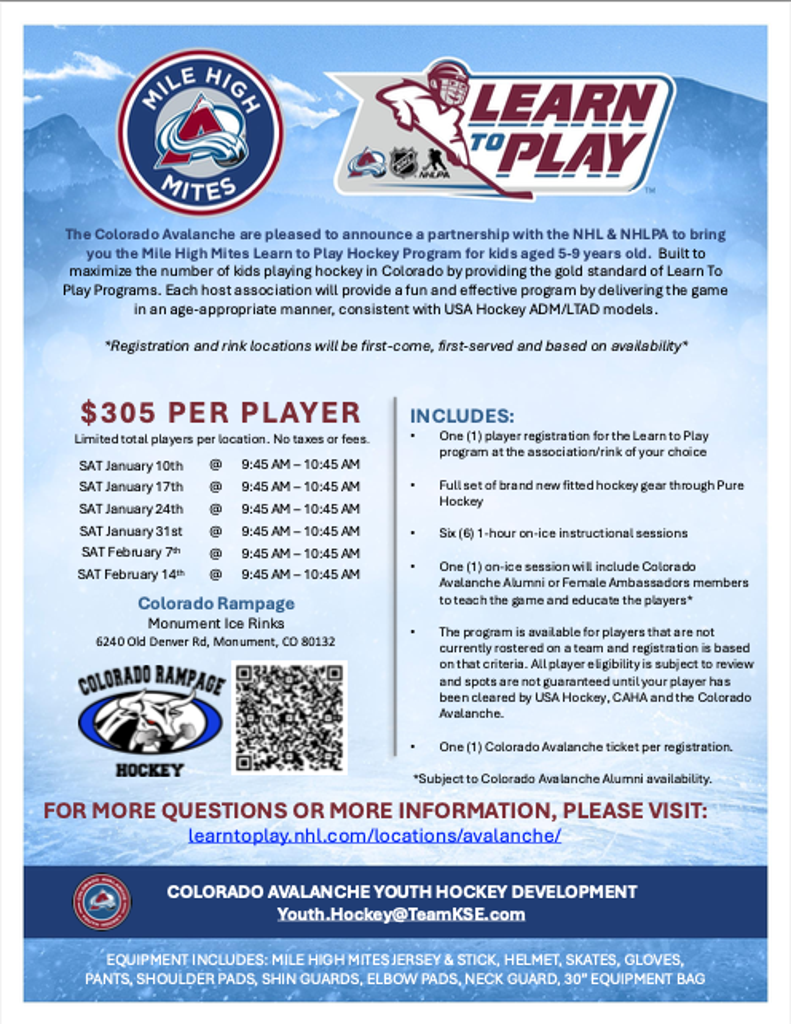 The Colorado Avalanche are pleased to announce a partnership with the NHL & NHLPA for the return of the Mile High Mites Learn to Play Hockey Program. Providing a full set of equipment, including skates and lessons, this is a perfect way to introduce your child to hockey! If you miss the Mile High Mites, you can still register for our Jr. Rookies program that is run all year long!